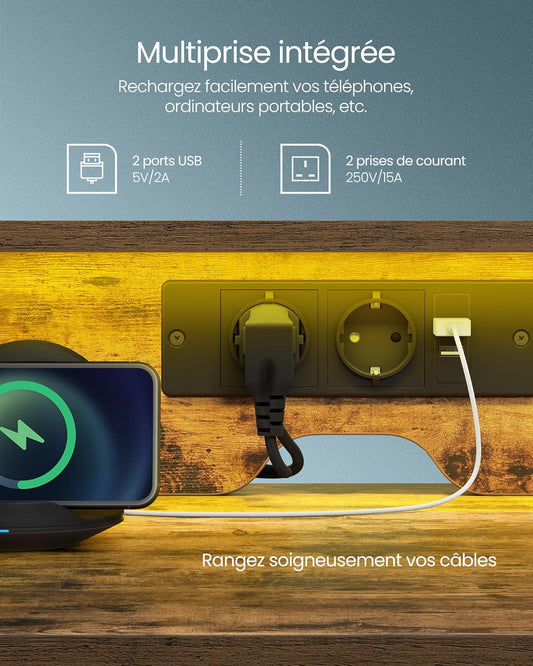 Bureau avec Lumières LED et Multiprise, Support d'Écran, Table avec Rangement, 2 Tiroirs en Tissu, 2 Ports USB